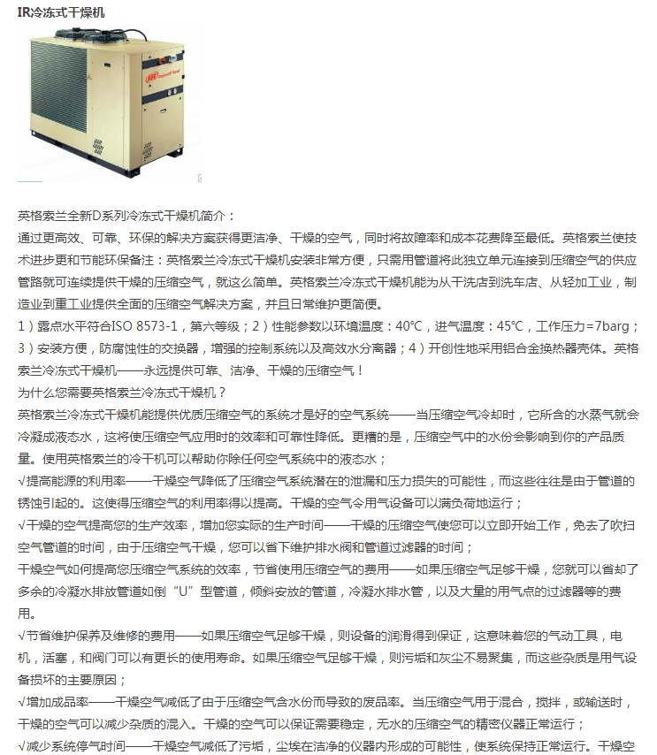•        濟南銳博特機械設(shè)備有限公司是英格索蘭空氣壓縮機的授權(quán)代理商,代理銷售美國英格索蘭全系列的空壓機及后續(xù)處理設(shè)備。公司自成立以來,經(jīng)過公司全體同仁不斷努力,開拓創(chuàng)新,以優(yōu)良的技術(shù)、完善的售后服務(wù),使得公司贏得了一個又一個的誠心客戶。我公司擁有多名專業(yè)的銷售及售后服務(wù)人員,為客戶提供空壓系統(tǒng)的售前、售中及售后的全方位優(yōu)質(zhì)服務(wù)。另公司有多名具有英格索蘭壓縮機授權(quán)服務(wù)證書的服務(wù)工程師,能維修和保養(yǎng)國內(nèi)外各種品牌空壓機,公司各種國內(nèi)外品牌空壓機配件庫存齊全。